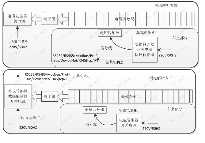 電磁誘導尺定位系統采用法拉第電磁感應定律(磁力線傳導原理)來檢測移動搬運設備的位移量,當電磁匹配器的線圈中通入交變電流時,在電磁匹配器附近會產生一個固定強度和固定頻率的交變磁場。電磁誘導尺附近似處在一個交變的、均勻分布的磁場中,每對電磁誘導尺的芯線會產生感應電動勢。電磁發生器的信號通過電磁耦合方式傳送到電磁誘導尺的感應環線上。數據解讀器對接收到的電位信號進行相位比較。交叉線的電位信號相位與平行線的電位信號相位相同,地址為“0”;交叉線的電位信號相位與平行線的電位信號相位相反,地址為“1”,這樣感應的地址信息是數字編碼排列,由此確定電磁匹配器在電磁誘導尺長度方向上的位置,對應就是移動搬運設備走行位置。