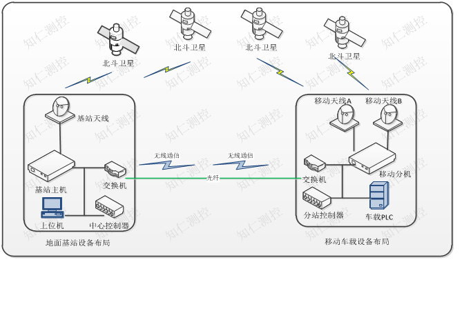 RTK差分原理:載波相位動態實時差分(Real-time kinematic)工作原理:在地面固定基礎上安裝基準站衛星接收機一臺,在移動設備上安裝一臺或者兩臺移動站衛星接收機;基準站和移動站上面的衛星接收機同時接受同一時間、同一BDS衛星發射的信號,基準站所獲得的觀測值與已知位置信息進行比較后得到BDS差分修正值;然后將這個修正值通過通信方式(無線通信、光纖通信)及時傳輸給共識衛星的流動站衛星接收機,修正移動站BDS觀察值、從而得到經差分修正后流動站較準確的實時姿態;